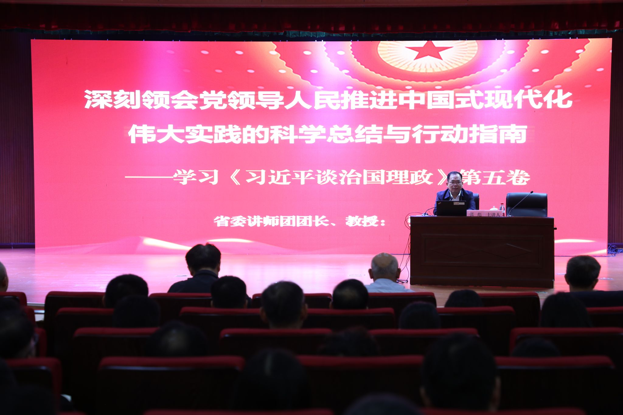 第一阶段,会议邀请安徽省委讲师团团长张彪教授作《深刻领会党领导人民推进中国式现代化伟大实践的科学总结与行动指南——学习<习近平谈治国理政>第五卷》专题辅导报告。他从深刻领会《习近平谈治国理政》第五卷的重大意义、准确把握《习近平谈治国理政》第五卷的丰富内涵、深刻把握“两个结合”是取得成功的最大法宝、精心组织学好用好《习近平谈治国理政》五卷等方面,系统梳理了第五卷的框架结构和逻辑脉络,深刻阐释了其中蕴含的新理念新思想新战略,并结合我校建设改革发展实际对如何学好用好这部重要著作提出了指导性意见。