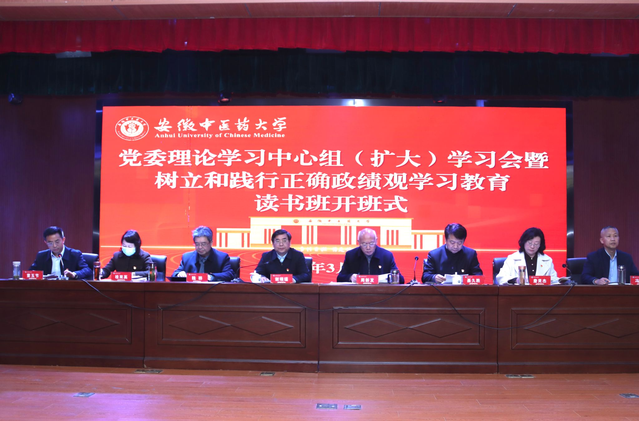 3月20日上午,学校在少荃湖校区举办党委理论学习中心组(扩大)学习会暨树立和践行正确政绩观学习教育读书班开班式,传达学习全国两会精神,学习习近平总书记在参加江苏代表团审议、看望参加政协会议的农工党九三学社医药卫生界社会福利和社会保障界委员时发表的重要讲话精神,学习贯彻习近平总书记关于树立和践行正确政绩观的重要论述。校领导谢瑞瑾、周新发、魏骅、聂久胜、桂双英、詹灵杰,校党委常委董玉节、冯祥出席开班式,校党委理论学习中心组成员、全体处级干部、学习教育专班成员参加。
