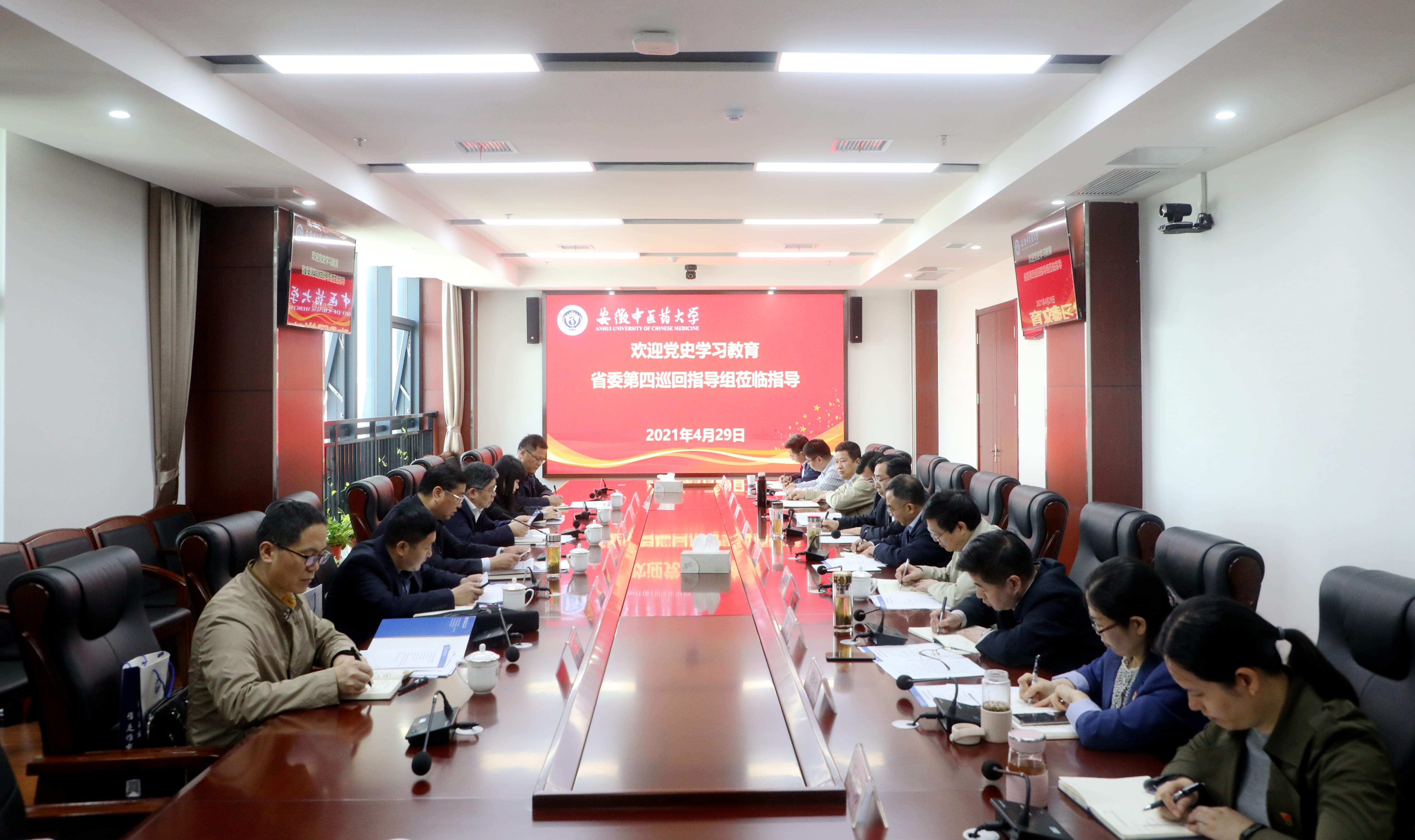 根据省委统一部署,4月29日上午,党史学习教育省委第四巡回指导组到安徽中医药大学开展巡回指导,并召开见面会听取学校党史学习教育开展情况工作汇报。省委第四巡回指导组组长、淮北市人大常委会主任方宗泽,副组长、安徽大学党委常委、纪委书记王忠,巡回指导组全体成员,安徽中医药大学党委书记王先俊、党委副书记张永群、纪委书记石金明出席见面会,学校党史学习教育领导小组成员参加会议。王先俊主持见面会。