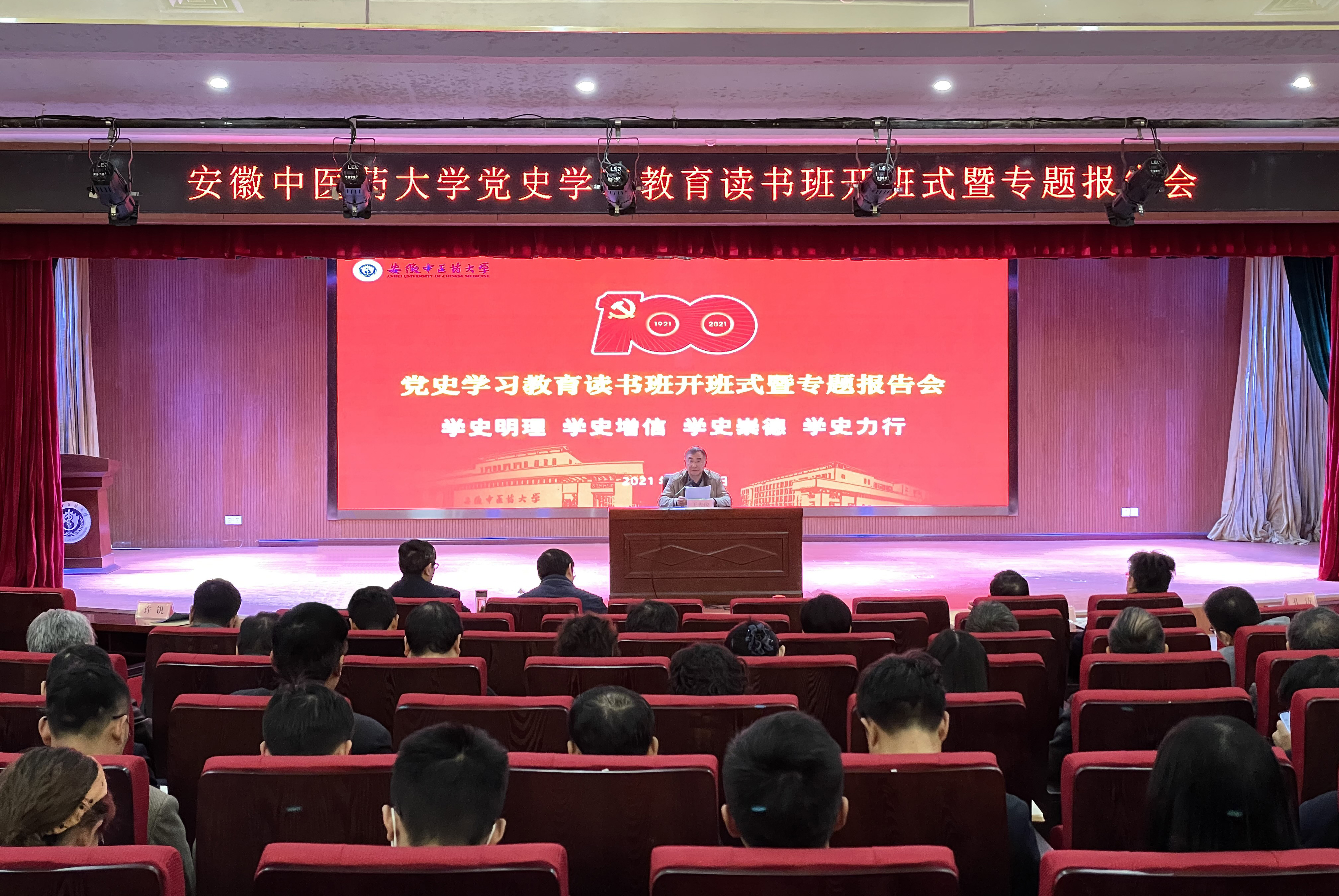 在学校二届三次党代会及二届四次教代会、工代会胜利闭幕不久,校党委决定举办处级干部党史学习教育读书班,进一步推进党史学习教育,在学史明理、学史增信、学史崇德、学史力行中更好地凝聚安中力量,开创发展新局。4月6日下午,学校党史学习教育读书班开班式暨报告会在少荃湖校区图书馆报告厅举行,校领导班子成员、校党委常委、中层干部、思政课教师、辅导员参加开班式。