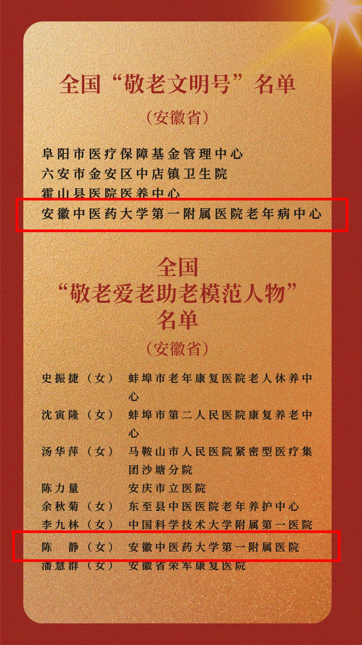 据了解,此次评选旨在表彰先进、树立榜样,进一步激励和动员全社会重视、支持和参与为老服务,营造敬老爱老助老社会氛围。医院将继续积极营造敬老爱老助老文明风尚,通过中医、中西医结合特色诊疗服务,从健康管理、疾病治疗、丰富精神生活等多维度提升老年人生活质量、增进老年人福祉,为促进新时代老龄事业高质量发展贡献更大力量。(第一临床医学院宣传统战部/文 聂久胜/审核)