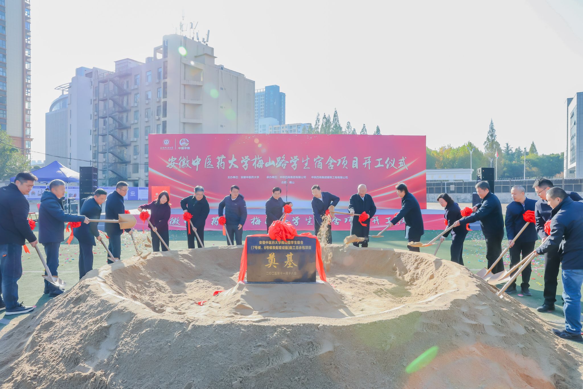 11月18日,由中铁四局集团有限公司和中铁四局集团建筑工程有限公司联合承建的安徽中医药大学梅山路学生宿舍项目正式开工建设。校领导谢瑞瑾、许钒、周新发、魏骅、聂久胜、桂双英、詹灵杰,党委常委董玉节、冯祥,以及学校相关处室、院部相关负责人,项目监理、施工等单位近百人参加项目开工仪式。校党委书记谢瑞瑾宣布项目开工,并同出席活动相关人员共同为项目奠基培土。