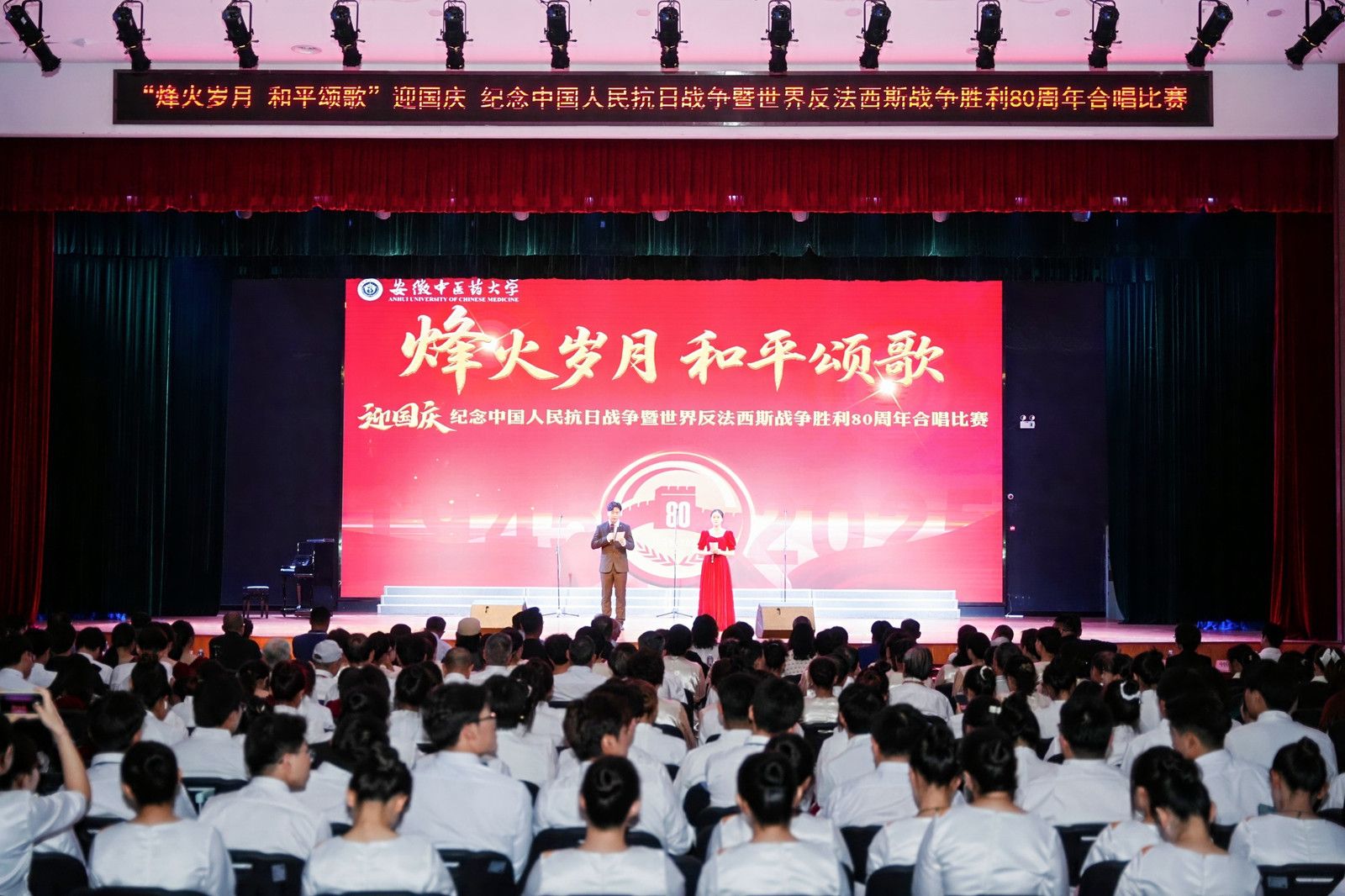 为纪念中国人民抗日战争暨世界反法西斯战争胜利80周年,进一步弘扬爱国主义精神,深情缅怀革命先烈,凝聚奋进力量,9月29日晚,学校举办“烽火岁月,和平颂歌”合唱比赛,校党委副书记周新发,校党委常委、副校长聂久胜,校党委常委、纪委书记、监察专员詹灵杰,校党委常委董玉节、冯祥,以及各职能部门、二级学院负责人与600余名师生共同观看了演出。