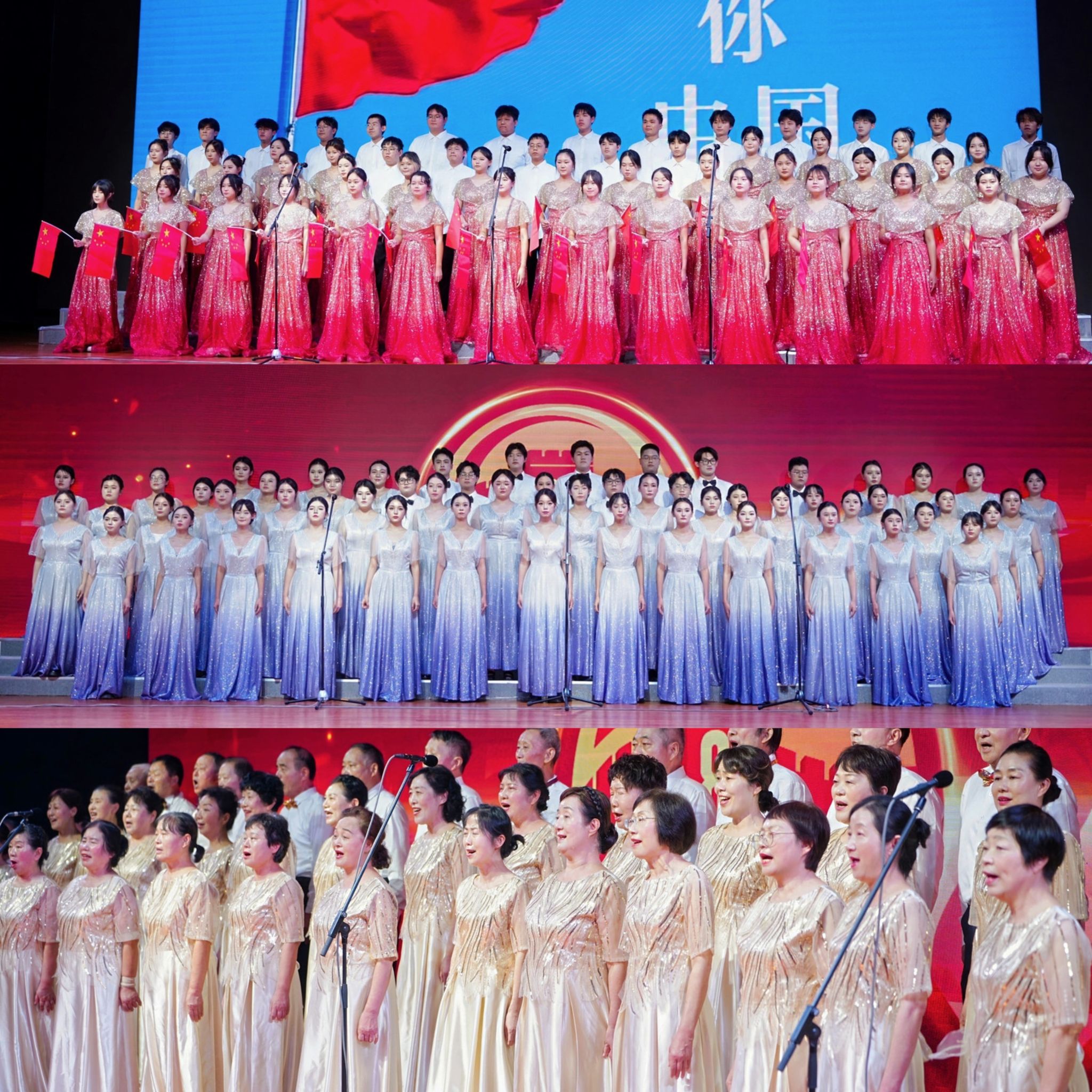 《团结就是力量》《保卫黄河》唱出了不屈的民族气节;《在太行山上》深情回顾烽火岁月,《如愿》则传递出新时代的美好愿景;当《我和我的祖国》旋律响起,全场师生情不自禁轻声跟唱;《没有共产党就没有新中国》奏响时,更将现场气氛推向高潮,激昂的歌声汇成一片红色的海洋;离退休工作处的老师们压轴献唱《在灿烂的阳光下》,用饱含岁月深情的歌声,唱出对祖国深沉的赞美与祝福,为整场演出画上圆满句号。
