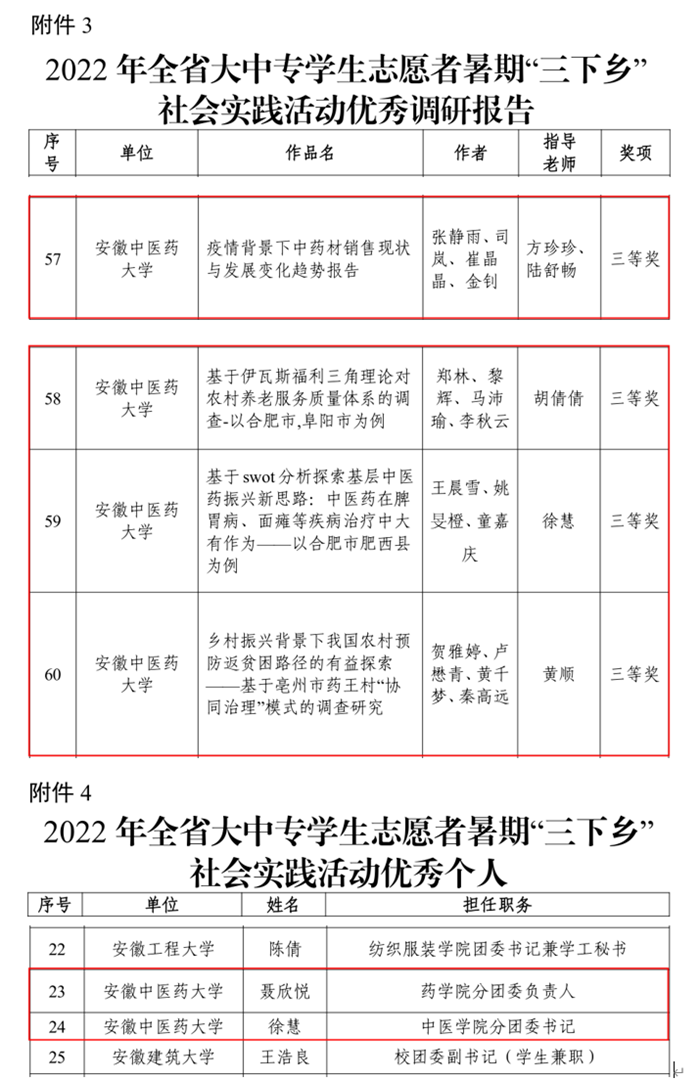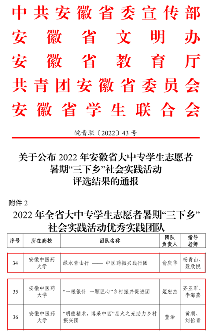 近日,省委宣传部、省文明办、省教育厅、团省委对在2022年安徽省大中专学生志愿者暑期“三下乡”社会实践活动中表现优秀、成绩突出的先进集体和个人进行表彰。我校“绿水青山行”——中医药振兴践行团(药学院)、“一根银针,一颗匠心”乡村振兴促进团(针灸推拿学院)、“明德精术,博采中西”星火之光助力乡村团(中西医结合学院)3个团队荣获社会实践优秀团队;药学院分团委负责人聂欣悦、中医学院分团委书记徐慧荣获优秀个人荣誉称号;4份调研报告荣获优秀调研报告三等奖;医药信息工程学院研究生聂壹琦、第一临床医学院本科生张炜婕获评全省“扬帆计划”政务企业实习“优秀个人”。