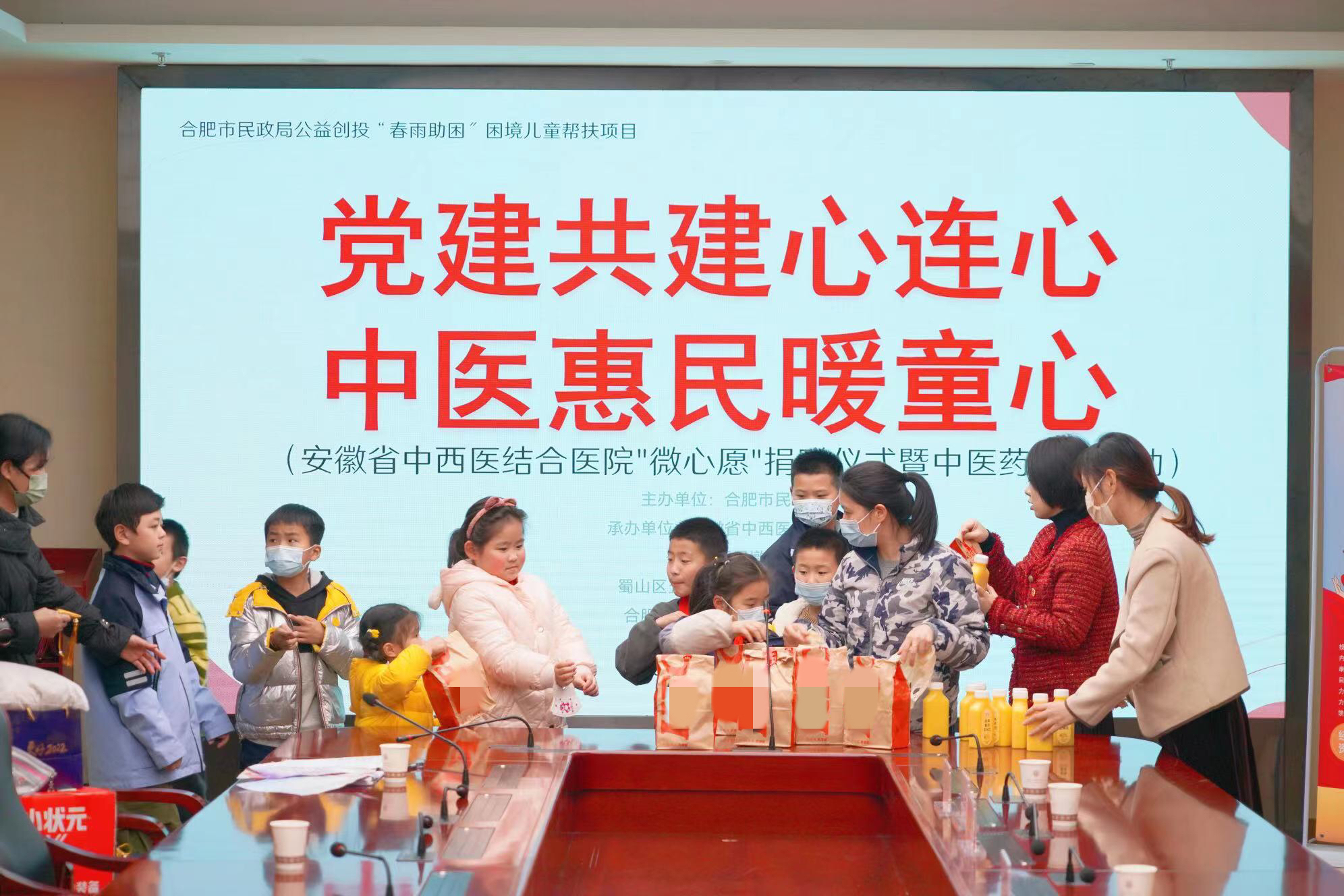 为进一步发挥中医药惠民优势,落实省、市“暖民心行动”工作安排,帮助困境儿童家庭解决实际困难,安徽省中西医结合医院联合合肥市民政局公益创投“春雨助困”困境儿童服务项目组及共建单位五里墩街道共同开展“党建共建心连心,中医惠民暖童心”活动,打通医院广大党员干部与区域内困境家庭“最后一公里”,实现零距离关爱帮扶。