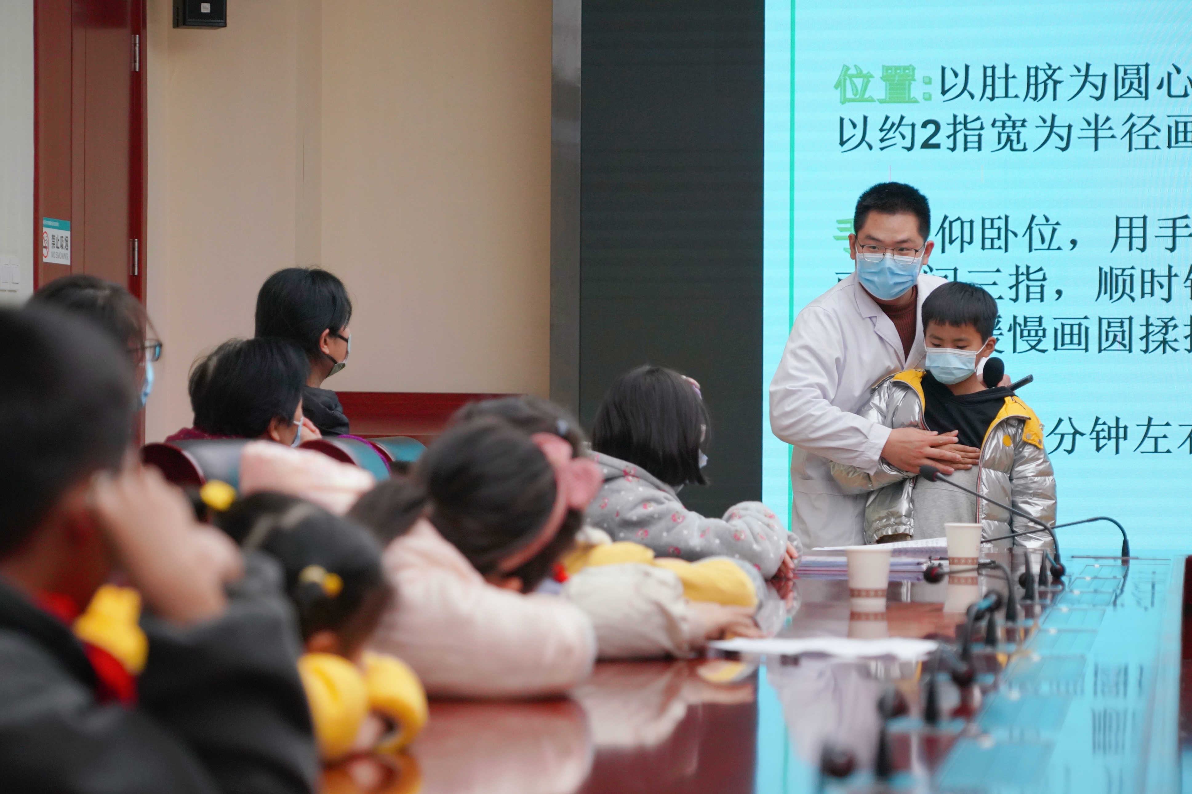 “小朋友们,你们知道怎么预防便秘吗?”医院内科第一党支部党员、推拿科医生杜鹏化身为和蔼可亲的杜老师,向孩子们介绍了小儿便秘等疾病的防治方法,向困境儿童家长示范了简便、易操作的保健推拿手法。大家不禁发出一阵阵惊呼,惊讶于中医药及传统推拿技法的神奇。