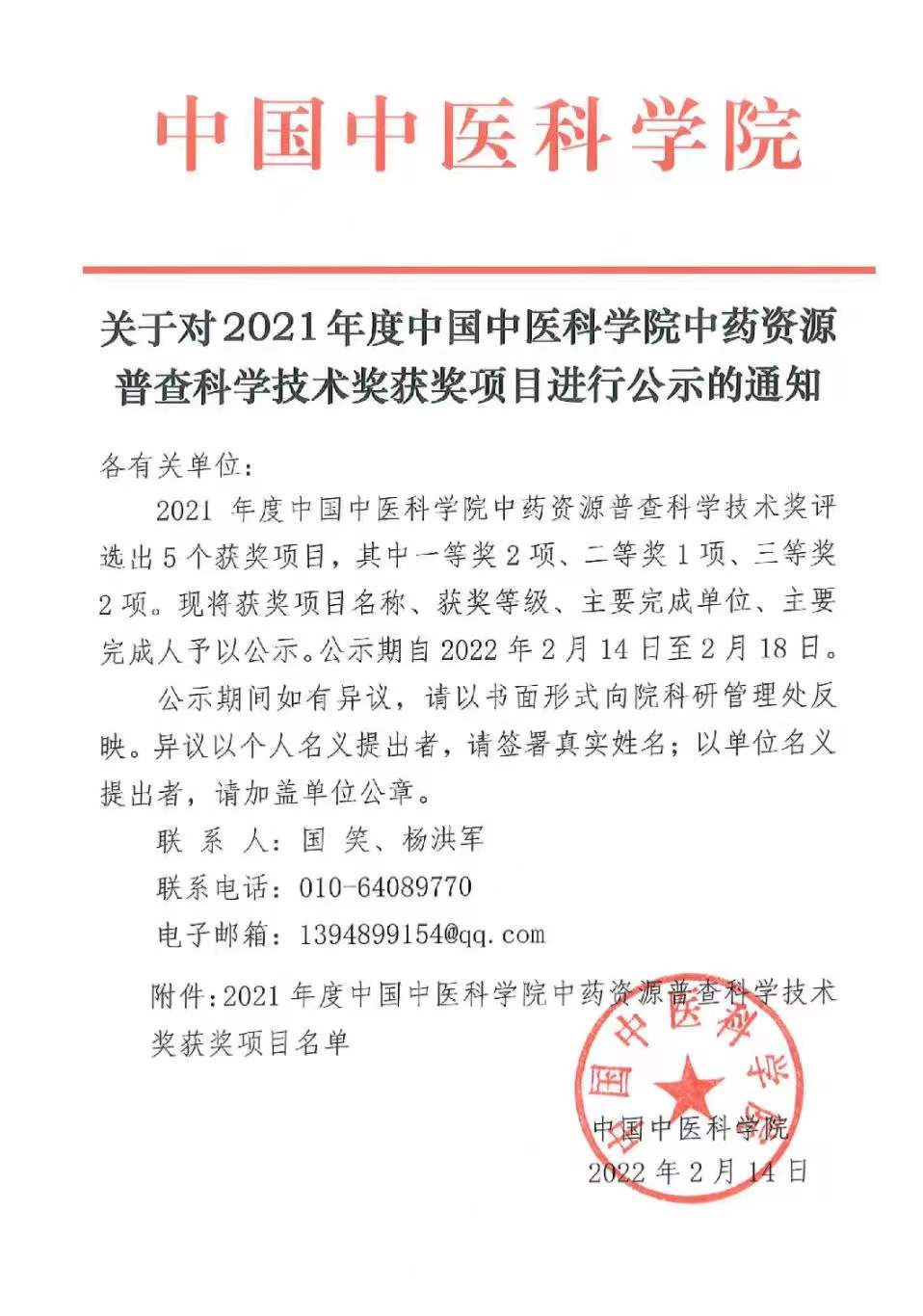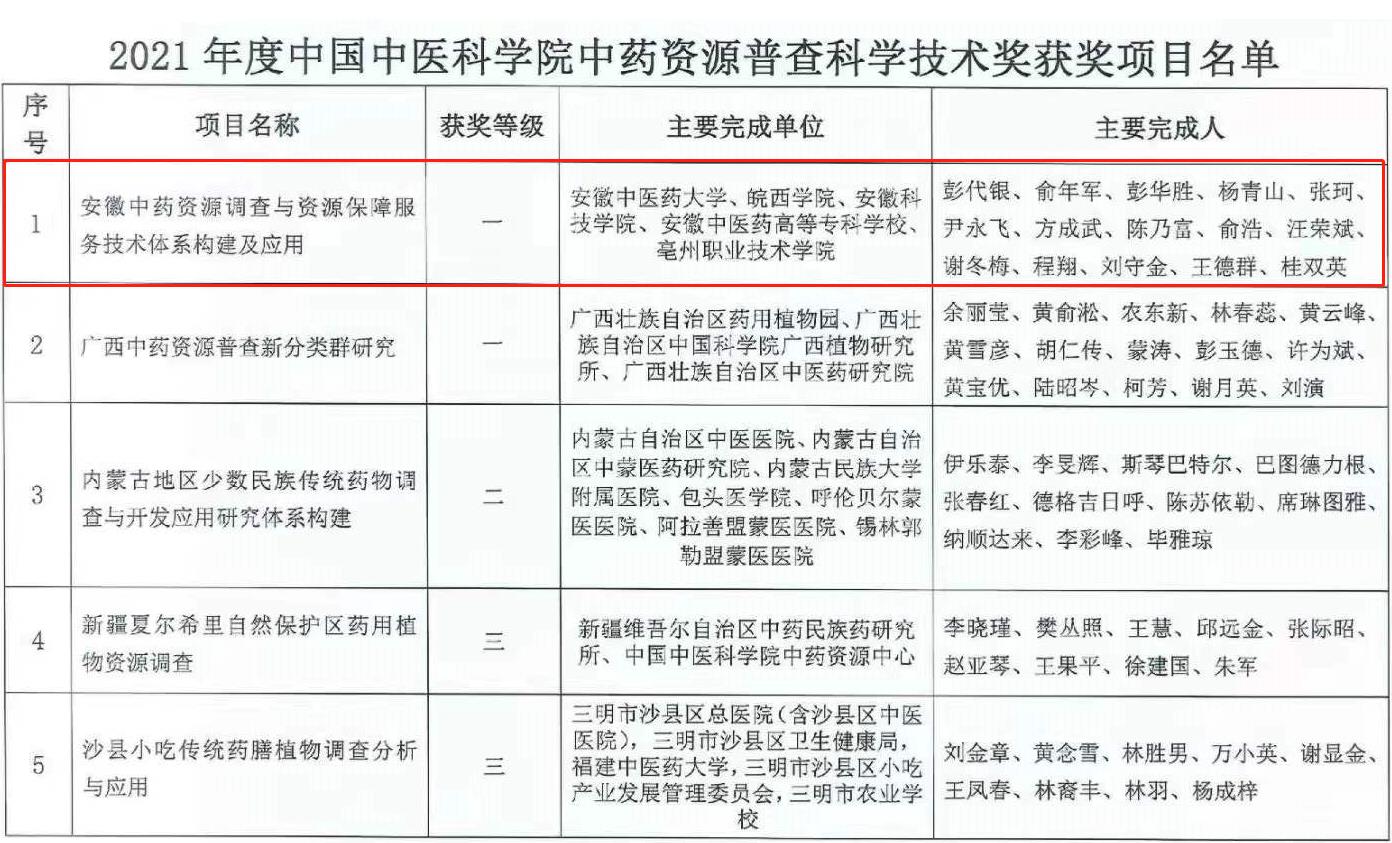 今天,中国中医科学院发布《关于对2021年度中国中医科学院中药资源普查科学技术奖获奖项目进行公示的通知》,我校牵头申报的“安徽中药资源调查与资源保障服务技术体系构建及应用”项目荣获一等奖。