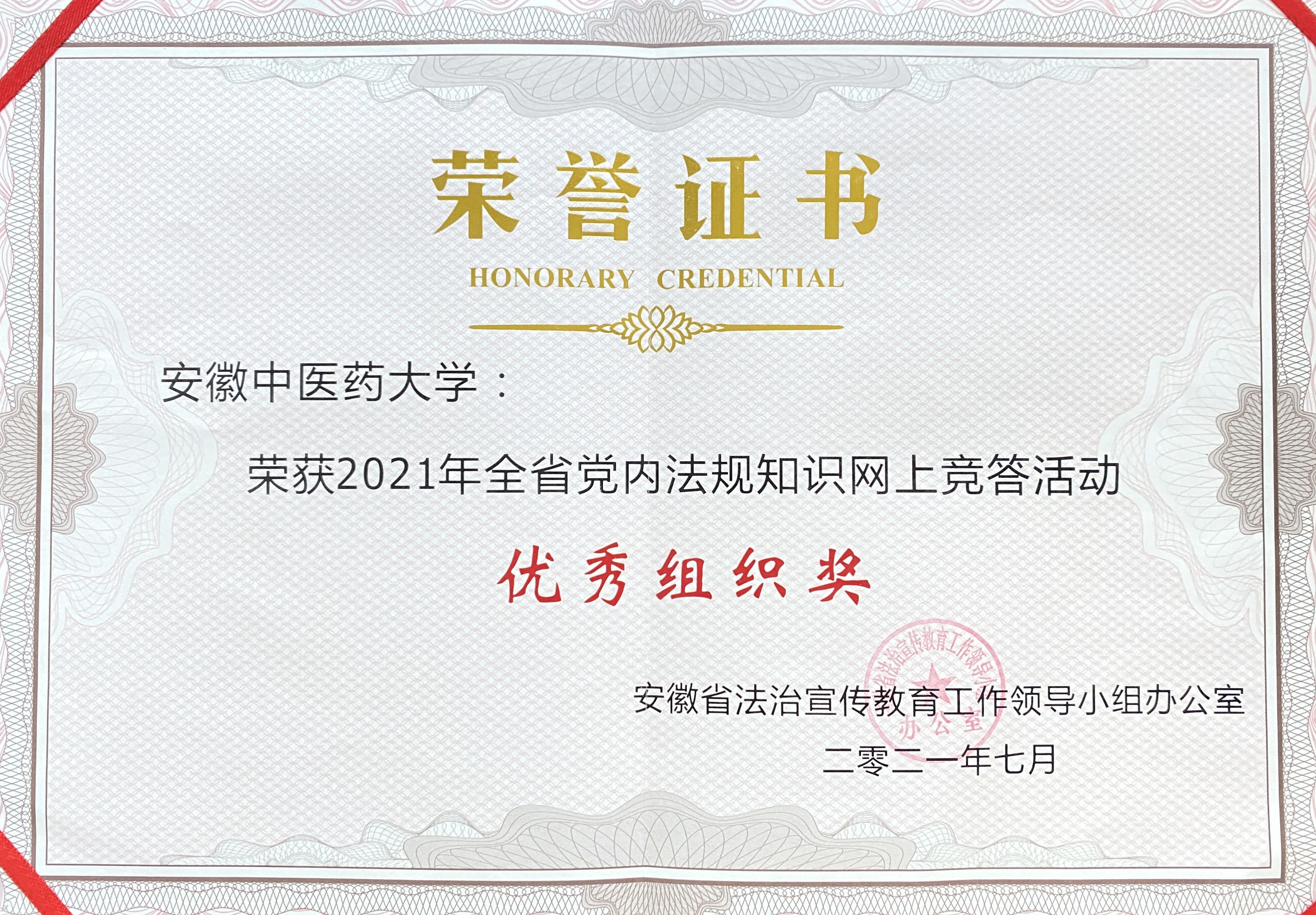 近日,省法宣办对全省党内法规知识网上竞答活动情况进行通报,安徽中医药大学获得“优秀组织奖”通报表扬。