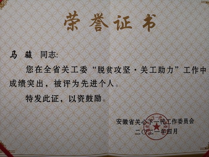 为充分发挥关工委“五老”先进典型的榜样示范作用,进一步引导激励各级关工委和广大“五老”为乡村振兴作出贡献,安徽省关工委授予63个单位“‘脱贫攻坚 关工助力’先进集体”称号,授予62名同志“‘脱贫攻坚 关工助力’先进个人”称号。此次表彰的先进集体和先进个人是在全省关工委系统“脱贫攻坚 关工助力”的基础上,由各省直辖市、系统关工委和县(市区关工委)推荐评选的,全省教育系统关工委仅马骏教授一人当选。