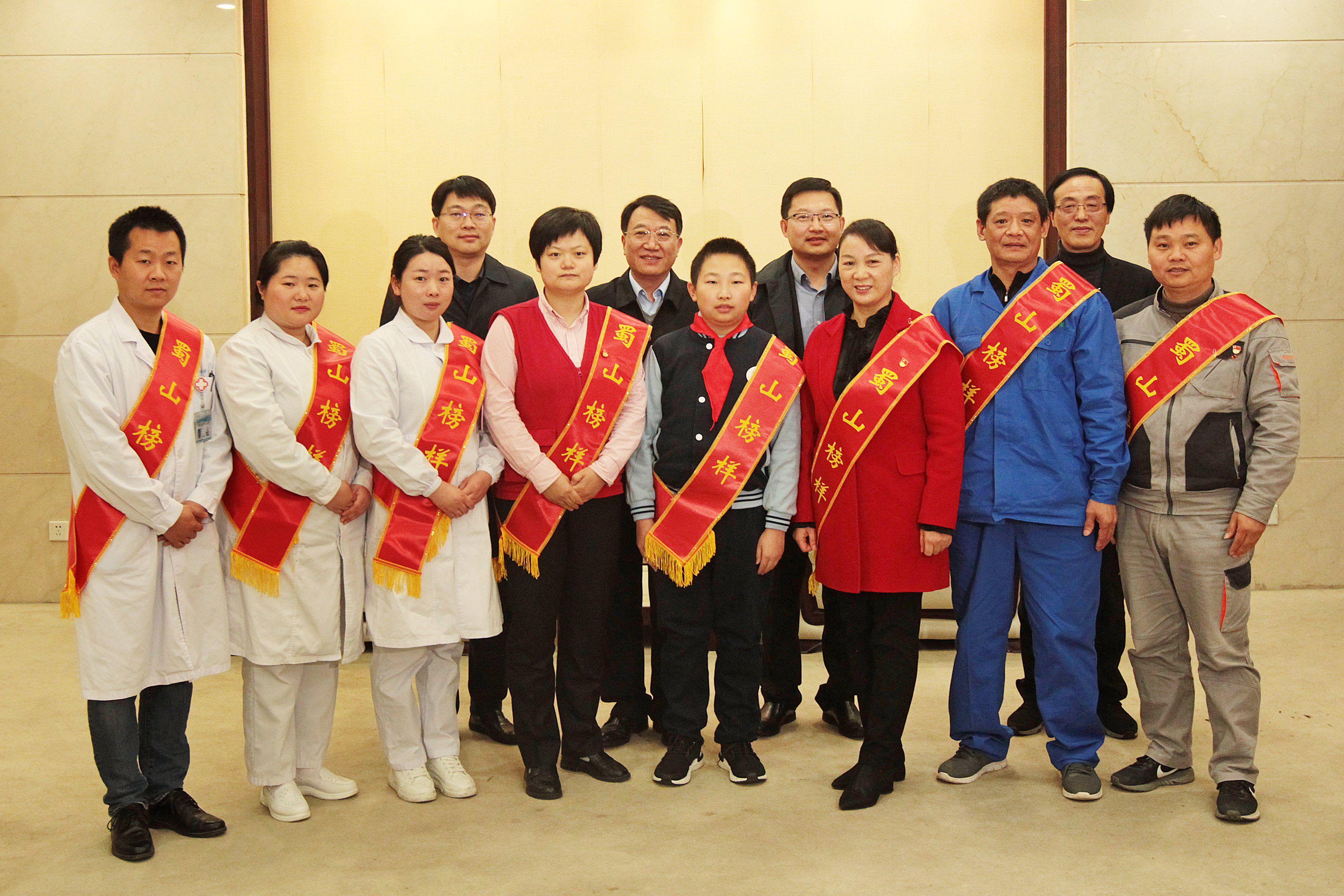12月1日下午,由合肥市文明办指导、中共蜀山区委、蜀山区人民政府主办;蜀山区委宣传部、蜀山区文明办、安徽商报社承办的“因为有你 蜀山更美——第七届蜀山区道德模范评选暨蜀山榜样‘五进’活动”温暖启动。合肥市委副书记罗云峰,省文明办副主任李国兵,合肥市文明办主任、宣传部副部长赵俊超等会见了榜样人物。启动会上,“助人为乐”、“见义勇为”、“诚实守信”、“敬业奉献”、“孝老爱亲”5组共20名模范与大家见面,分享他们的故事。其中,我校三附院援鄂医疗队员韦彪、代冰雪、许孝姗获评“见义勇为道德模范”。榜样们用最淳朴的语言,说出了最铿锵有力的故事,他们的感人事迹和身上蕴含的精神力量直击心灵,现场观众以雷鸣般的掌声表达出对他们的敬意。