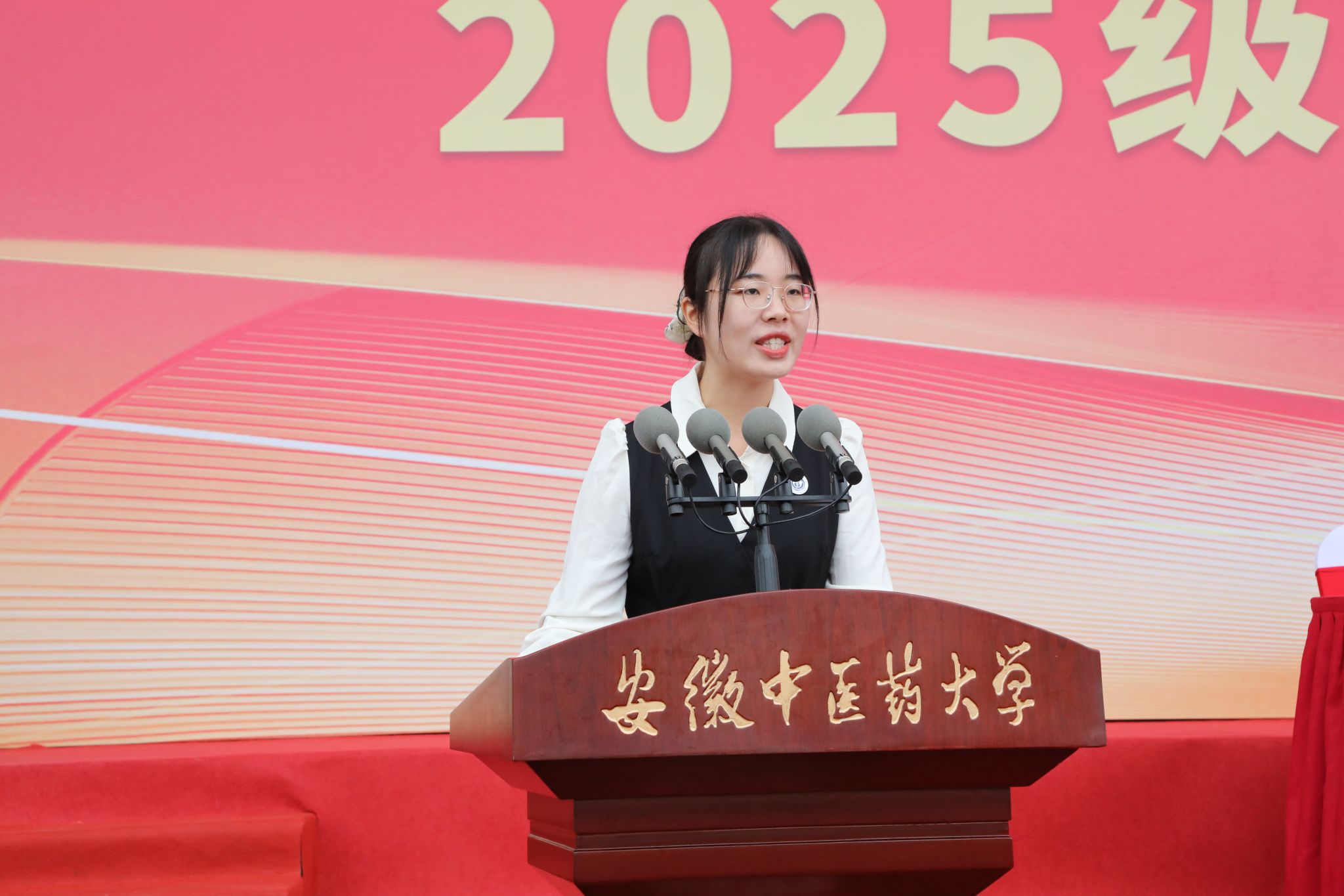 第一临床医学院2025级中医学5+3一体化专业史林钊同学、药学院中药学专业博士研究生刘琴同学作为新生代表发言,期待在“安中大”的新征程中,努力学习,不断创新,勇担中医药传承创新发展的重任;以青春为笔,以校训为墨,让中医药千年智慧焕新,为健康中国注入更多中医药力量。